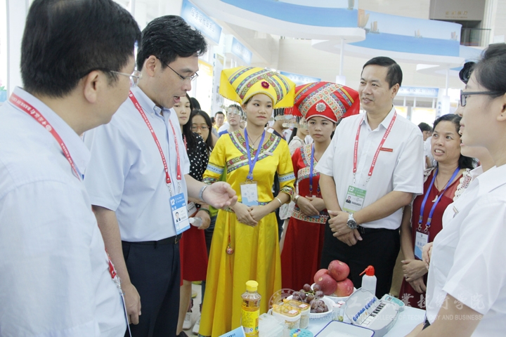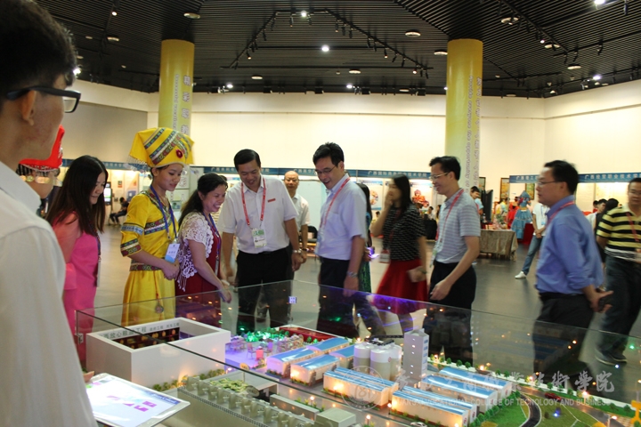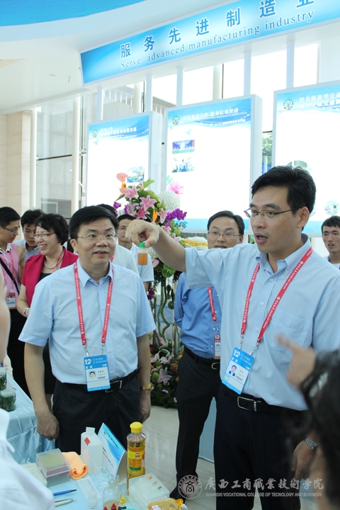 2015年9月19日,自治區(qū)高校工委書記、教育廳廳長秦斌、副廳長黃雄彪、職成處萬鋒鋒副處長等一行觀看東盟職教聯(lián)展。