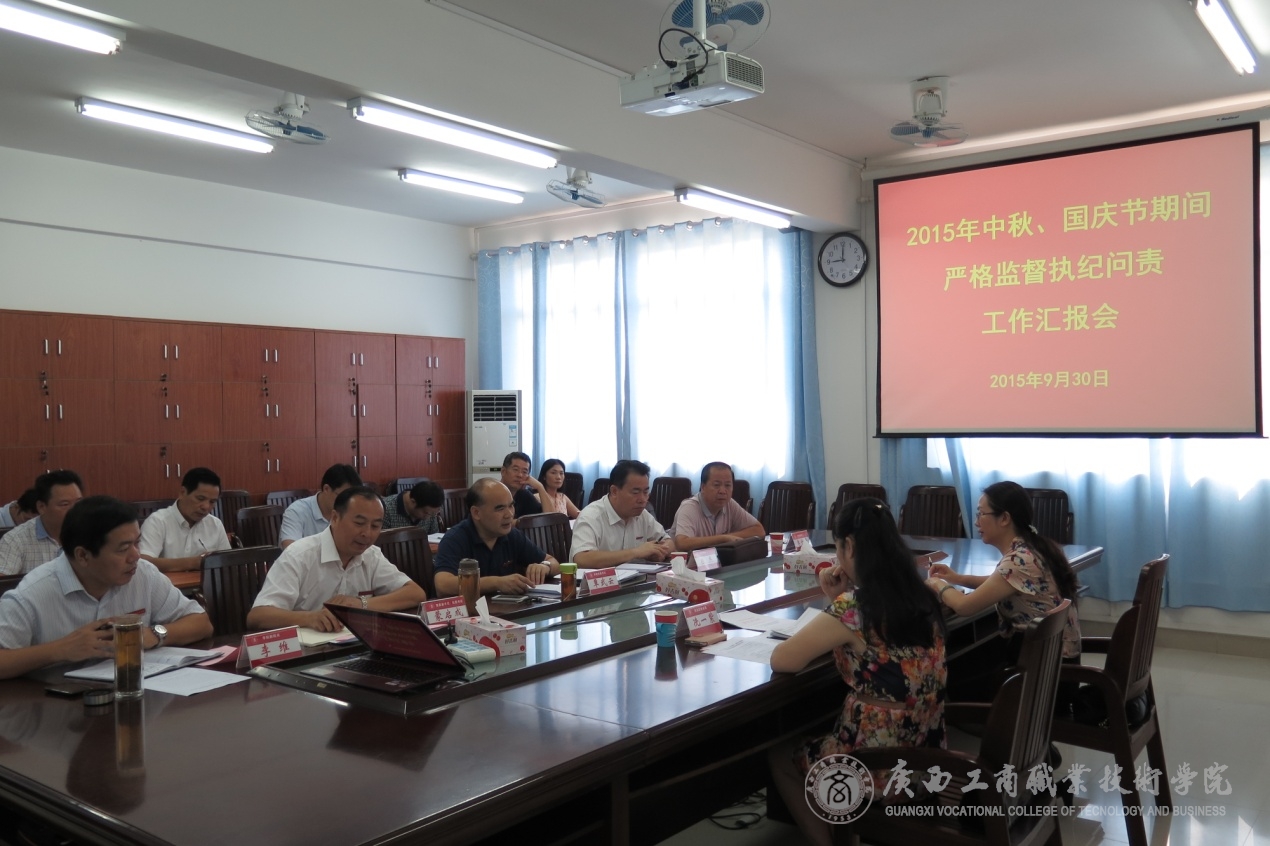 9月30日上午,關(guān)于2015年中秋、國(guó)慶節(jié)期間嚴(yán)格監(jiān)督執(zhí)紀(jì)問(wèn)責(zé)工作匯報(bào)會(huì)在我院校本部教學(xué)樓2109會(huì)議室召開(kāi),自治區(qū)糧食局黨組成員、紀(jì)檢組組長(zhǎng)歐澤馨和局機(jī)關(guān)黨委副調(diào)研員冼一紫參加工作匯報(bào)會(huì),聽(tīng)取2015年中秋、國(guó)慶節(jié)期間嚴(yán)格監(jiān)督執(zhí)紀(jì)問(wèn)責(zé)工作的匯報(bào),學(xué)院領(lǐng)導(dǎo)覃武云、陳杰、蒙啟成、李仕欽、李維,各黨政部門負(fù)責(zé)人、監(jiān)察審計(jì)室全體人員參加了會(huì)議。