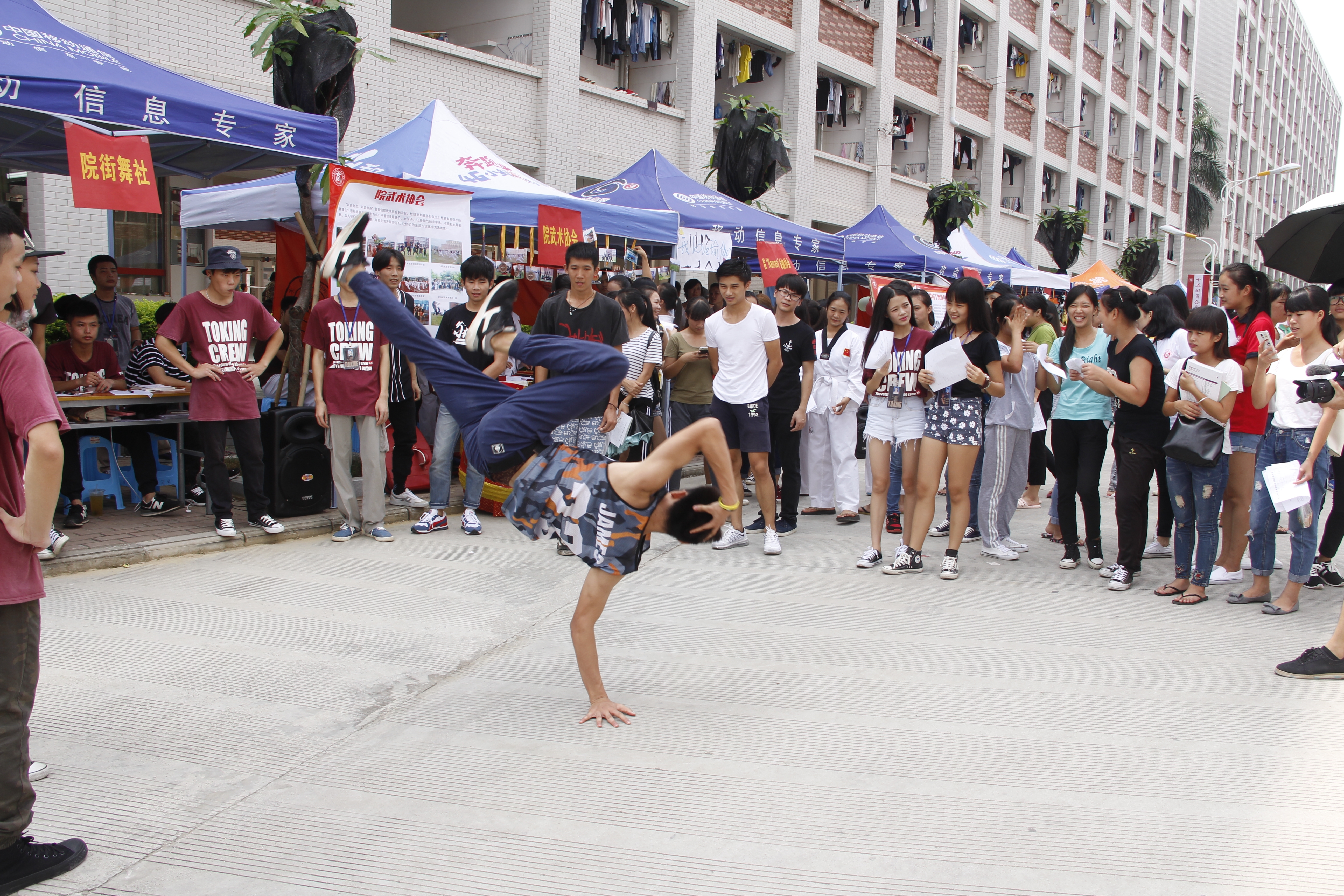 現(xiàn)場,街舞社的成員隨著音樂,盡情起舞,吸引了不少新生的眼球???輪滑社的會員則在現(xiàn)場集體表演極限跳人、跳拋臺,使正在行走的新生停下了腳步,駐足觀賞炫酷的花式輪滑表演,現(xiàn)場氣氛持續(xù)高漲。動漫協(xié)會的成員則個個都以COSPLAY裝束展示。音樂協(xié)會則搬出架子鼓、電吉他等樂器助陣。