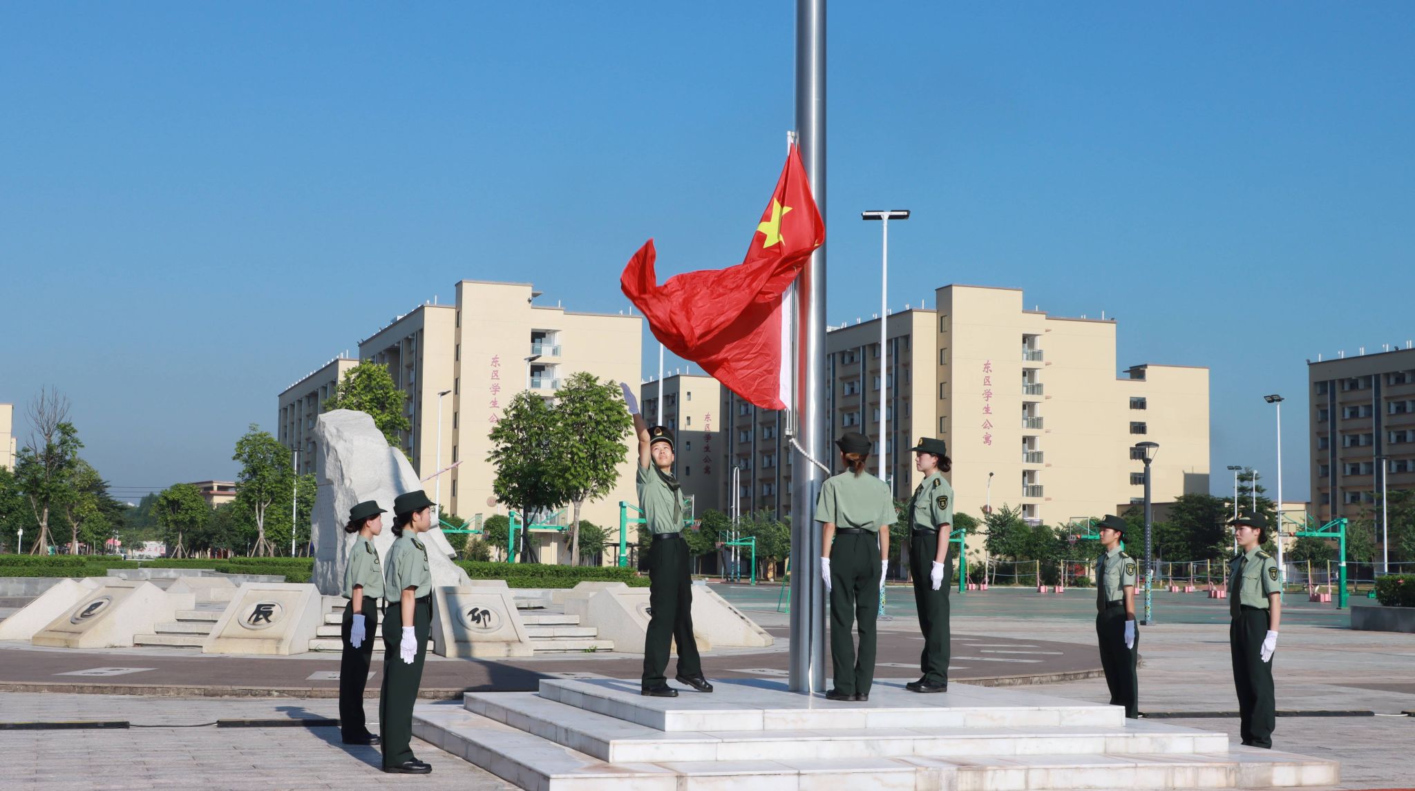 伴隨著《義勇軍進(jìn)行曲》莊嚴(yán)的旋律,升旗儀式正式開始,全體人員行注目禮,向冉冉升起的五星紅旗表達(dá)最深的敬意。