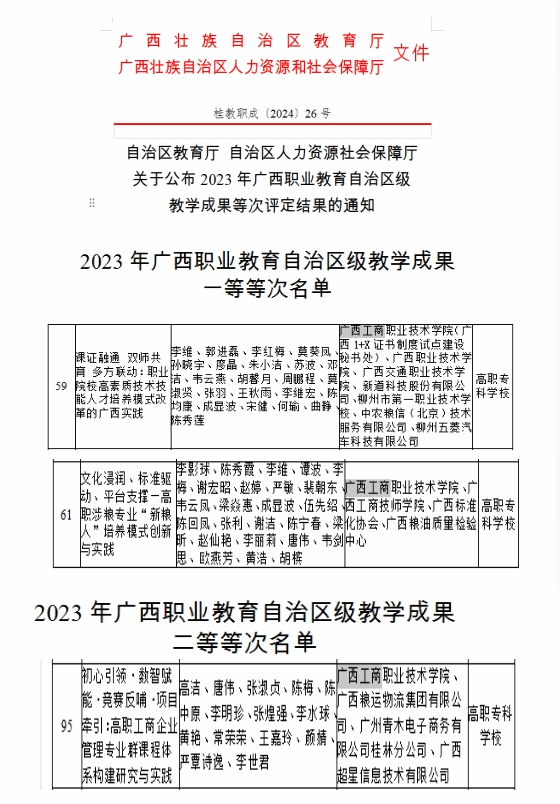 李維教授主持的《課證融通 雙師共育 多方聯(lián)動:職業(yè)院校高素質技術技能人才培養(yǎng)模式改革的廣西實踐》和李影球教授主持的《文化浸潤、標準驅動、平臺支撐—高職涉糧專業(yè)“新糧人”培養(yǎng)模式創(chuàng)新與實踐》均獲得一等等次,高潔教授主持的《初心引領·數(shù)智賦能競賽反哺·項目牽引:高職工商企業(yè)管理專業(yè)群課程體系構建研究與實踐》獲得自治區(qū)二等等次。