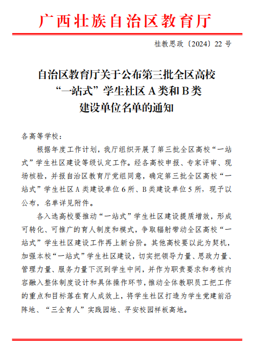 近日,自治區(qū)教育廳公布第三批全區(qū)高?!耙徽臼健睂W(xué)生社區(qū)A類和B類建設(shè)單位名單,我校經(jīng)申報(bào)、專家評(píng)審、現(xiàn)場(chǎng)核驗(yàn)并報(bào)自治區(qū)教育廳黨組同意,被確定為第三批全區(qū)高校“一站式學(xué)生社區(qū)A類建設(shè)單位。