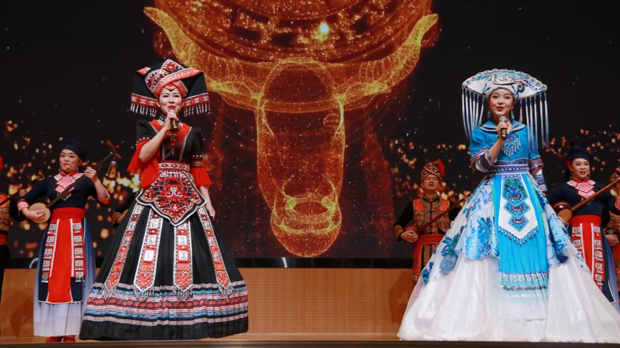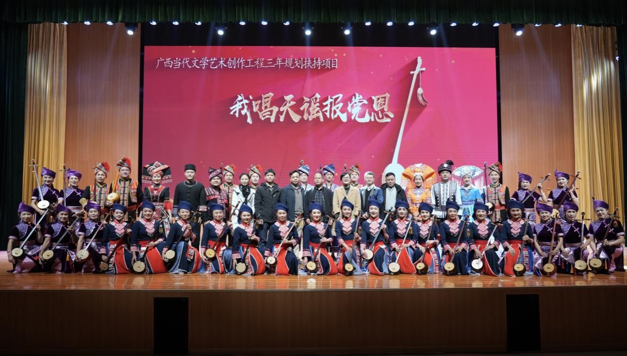 為貫徹落實(shí)習(xí)近平文化思想,進(jìn)一步推動壯族天琴發(fā)展,充分發(fā)揮壯族天琴在傳承中華優(yōu)秀傳統(tǒng)文化、豐富高校精神文化生活、提升基層公共文化服務(wù)水平中的積極作用,2024年12月17日,自治區(qū)黨委宣傳部廣西當(dāng)代文學(xué)藝術(shù)創(chuàng)作工程扶持項目“壯族天琴歌舞樂《我唱天謠報黨恩》”走進(jìn)我校,在武鳴校區(qū)學(xué)術(shù)活動中心成功演出2場。