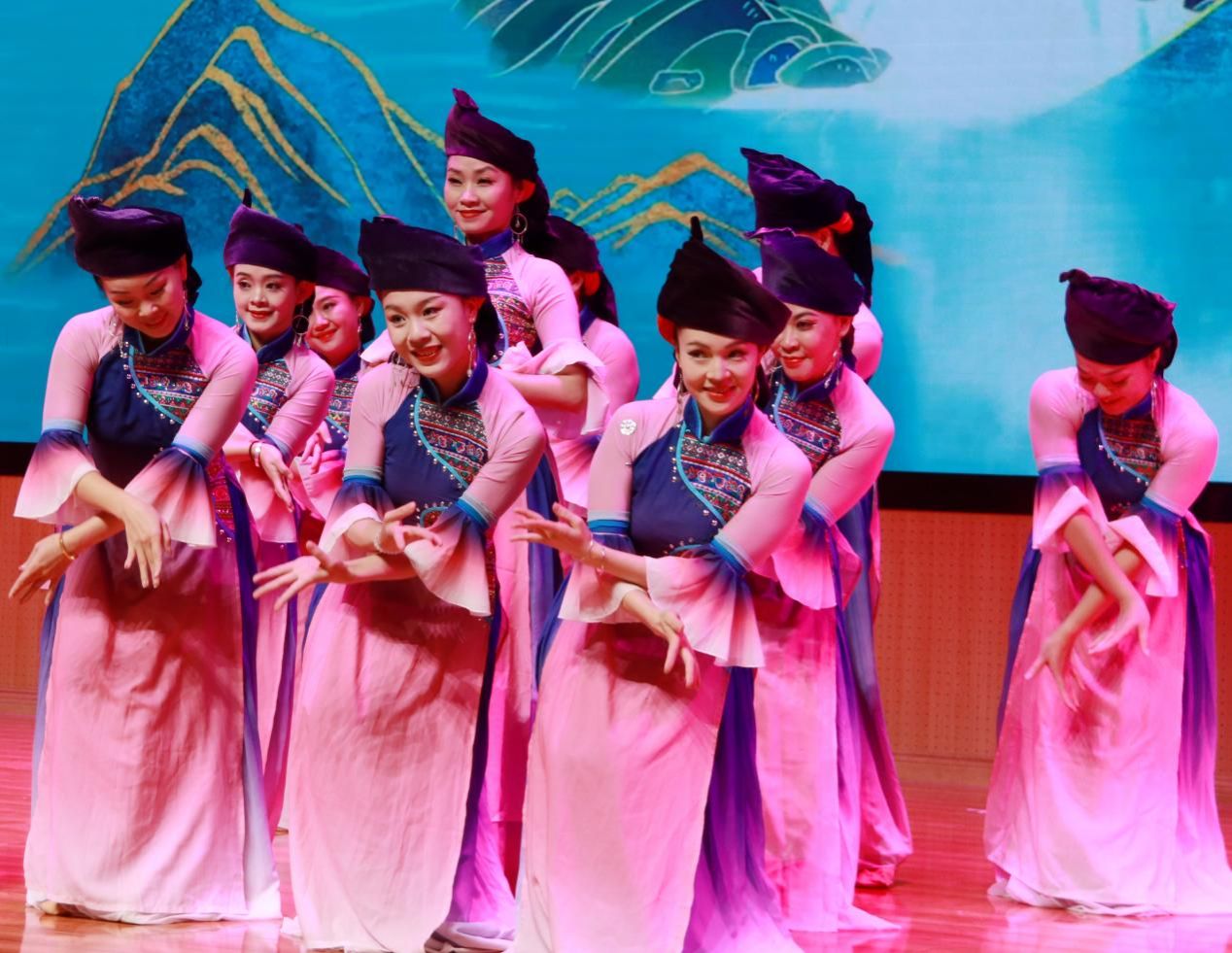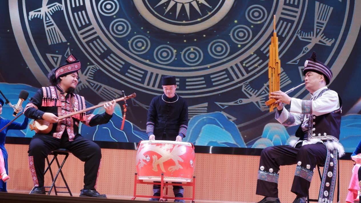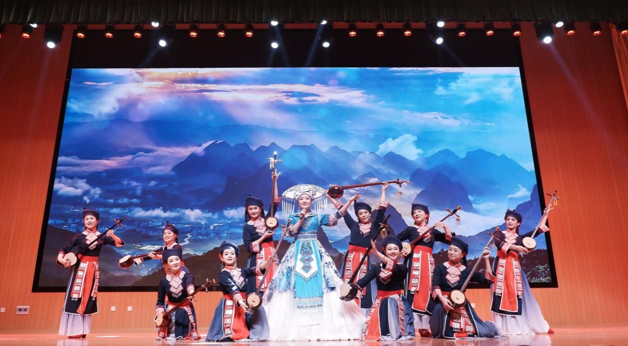 天琴,作為壯族古老的彈撥樂器,承載著豐富的民族文化和歷史記憶。2021年,壯族天琴藝術(shù)被列入國家級非物質(zhì)文化遺產(chǎn)代表性項目名錄?!段页熘{報黨恩》是一部展示壯族天琴藝術(shù)的歌舞樂劇目,劇目內(nèi)容緊扣時代脈搏,與中華優(yōu)秀傳統(tǒng)文化相互映照,展示了壯族人民滿懷信心,沿著黨中央指引的方向,昂首闊步踏上新征程。劇目中傳統(tǒng)音樂與現(xiàn)代音樂相融合,更符合現(xiàn)代觀眾的審美,贏得了現(xiàn)場師生的陣陣掌聲。