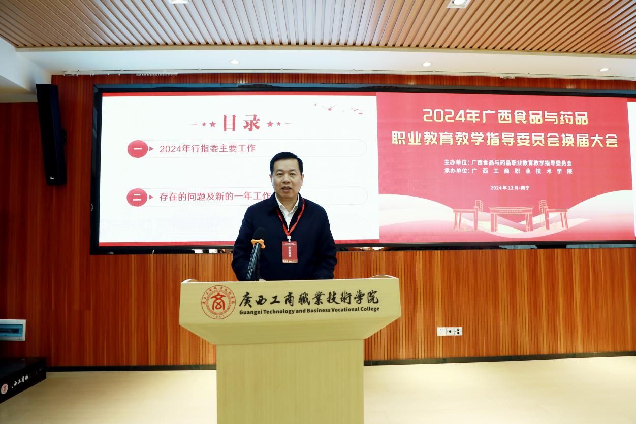 學校黨委書記、廣西食品與藥品行指委副主任委員李維作廣西食品藥品專業(yè)教育教學指導委員會2024年工作總結(jié)及2025年工作計劃。他表示,在自治區(qū)教育廳、自治區(qū)工信廳的領(lǐng)導下,廣西食品與藥品行指委統(tǒng)籌各成員單位積極配合,今年圓滿完成了行指委工作計劃和行動計劃提出的階段性任務(wù),教育教學質(zhì)量顯著提升。李維指出,新一屆行指委將緊緊圍繞國家深化教育教學改革決策部署,切實推動食品藥品職業(yè)教育取得新成效。一是進一步加強工作信息報告機制,完善行指委委員的工作職責,促進各單位建設(shè)經(jīng)驗交流。二是要做好頂層設(shè)計,打造高水平專業(yè)群;加強校企合作,建設(shè)一流核心課程;完善管理機制,校企雙元開發(fā)新形態(tài)教材;進培養(yǎng)結(jié)合,建設(shè)高水平雙師隊伍;深化產(chǎn)教融合,打造行業(yè)產(chǎn)教融合共同體;推動職教出海,為“一帶一路”建設(shè)獻“糧”策。