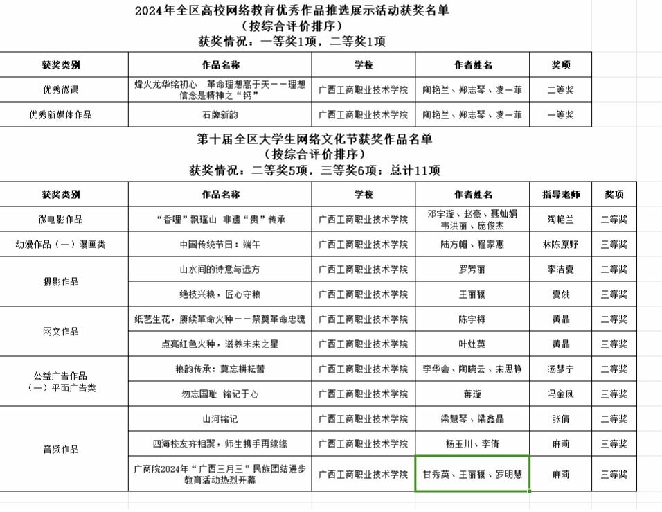 近日,自治區(qū)教育廳和自治區(qū)黨委網信辦公布第十屆全區(qū)大學生網絡文化節(jié)和2024年全區(qū)高校網絡教育優(yōu)秀作品推選展示活動獲獎名單,我校在優(yōu)秀微課、優(yōu)秀新媒體作品、微電影、漫畫、攝影、網文、公益廣告、音頻等8類作品的征集中榮獲13個獎項,其中一等獎1個、二等獎6個、三等獎6個。