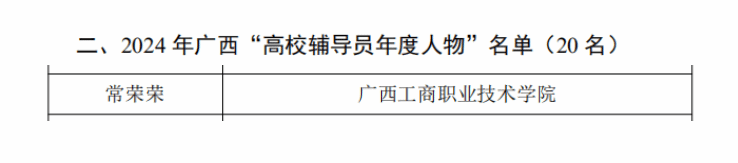 近日,2024年廣西“最美高校輔導(dǎo)員”暨“高校輔導(dǎo)員年度人物”推選展示活動(dòng)結(jié)果揭曉。我校教師常榮榮獲評(píng)2024年廣西“高校輔導(dǎo)員年度人物”。