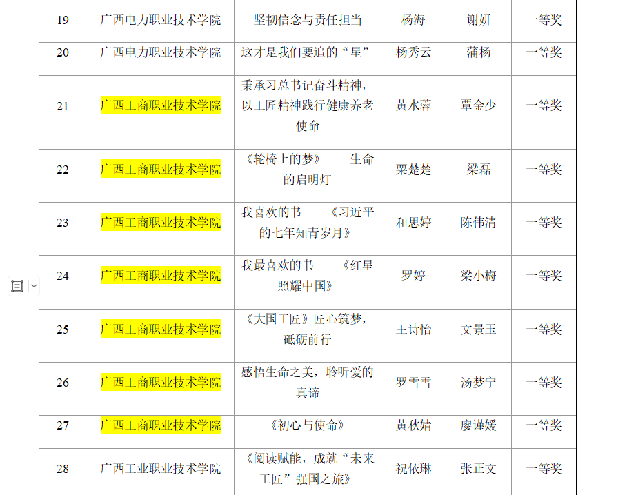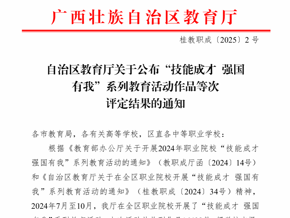 近日,自治區(qū)教育廳公布了2024年全區(qū)“技能成才 強(qiáng)國(guó)有我”系列教育活動(dòng)作品等次評(píng)定結(jié)果,我校在此次活動(dòng)中表現(xiàn)優(yōu)異,共推薦319項(xiàng)作品和2個(gè)典型案例入圍區(qū)賽。經(jīng)過(guò)激烈角逐,我校斬獲佳績(jī):34項(xiàng)作品榮獲一等獎(jiǎng),68項(xiàng)作品榮獲二等獎(jiǎng),105項(xiàng)作品榮獲三等獎(jiǎng),《“歌”傳工匠心,“聲”立報(bào)國(guó)志——廣西工商職業(yè)技術(shù)學(xué)院“山歌+”育人模式創(chuàng)新案例》榮獲優(yōu)秀典型案例。此外,學(xué)校還榮獲優(yōu)秀組織獎(jiǎng),充分展現(xiàn)了我校在技能教育和人才培養(yǎng)方面的成果。