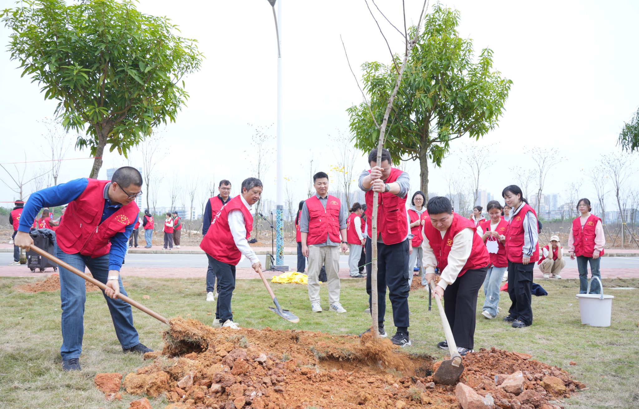 隨后,青年師生們以6-7人為一組,大家分工協(xié)作、默契配合,揮鍬鏟土、扶苗填坑、澆水灌溉、掛牌寄愿,整個(gè)場面繁忙而有序。經(jīng)過一個(gè)多小時(shí)的努力,20株鳳凰木全部種植完成,一顆顆綠色的樹苗形成了一道亮麗的風(fēng)景線。