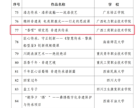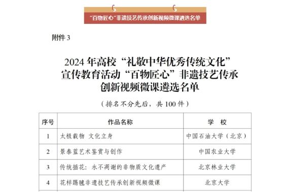 近日,教育部辦公廳公布了2024年高?!岸Y敬中華優(yōu)秀傳統(tǒng)文化”宣傳教育活動(dòng)優(yōu)秀作品名單,我校報(bào)送的作品《“香哩”頌黨恩 非遺共傳承》入選“百物匠心”非遺技藝傳承創(chuàng)新視頻微課名單。該作品后續(xù)將通過央視網(wǎng)、新華網(wǎng)、中國(guó)教育發(fā)布等平臺(tái)進(jìn)行專題宣傳展示。