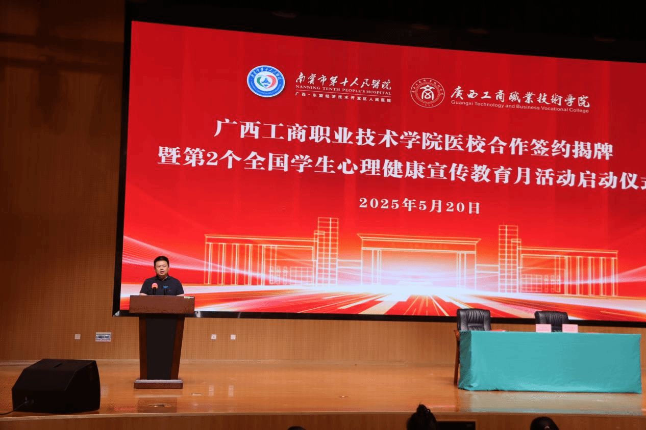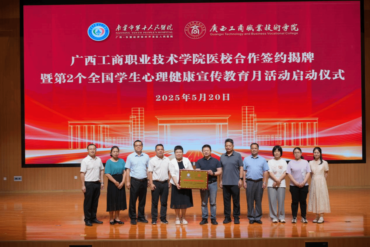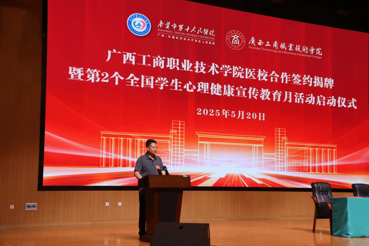 為貫徹落實(shí)《教育部辦公廳關(guān)于開展第2個(gè)全國學(xué)生心理健康宣傳教育月活動(dòng)的通知》有關(guān)要求,同時(shí)切實(shí)加強(qiáng)醫(yī)校合作,推動(dòng)學(xué)生心理健康工作提質(zhì)增效,促進(jìn)學(xué)生身心健康發(fā)展。2025年5月20日下午,學(xué)校學(xué)生工作處心理健康教育與咨詢中心在武鳴校區(qū)學(xué)術(shù)活動(dòng)中心開展醫(yī)校合作簽約揭牌暨2025年第2個(gè)全國學(xué)生心理健康宣傳教育月活動(dòng)啟動(dòng)儀式。出席本次活動(dòng)的領(lǐng)導(dǎo)及嘉賓有:廣西東盟經(jīng)開區(qū)管委會(huì)黨工委副書記韋耿,南寧市第十人民醫(yī)院院長朱云峰,學(xué)校黨委學(xué)工部部長譚波,副部長李朝鋒、心理健康教育與咨詢中心副主任陳寧以及南寧市第十人民醫(yī)院相關(guān)診療科室負(fù)責(zé)人醫(yī)師和師生代表。