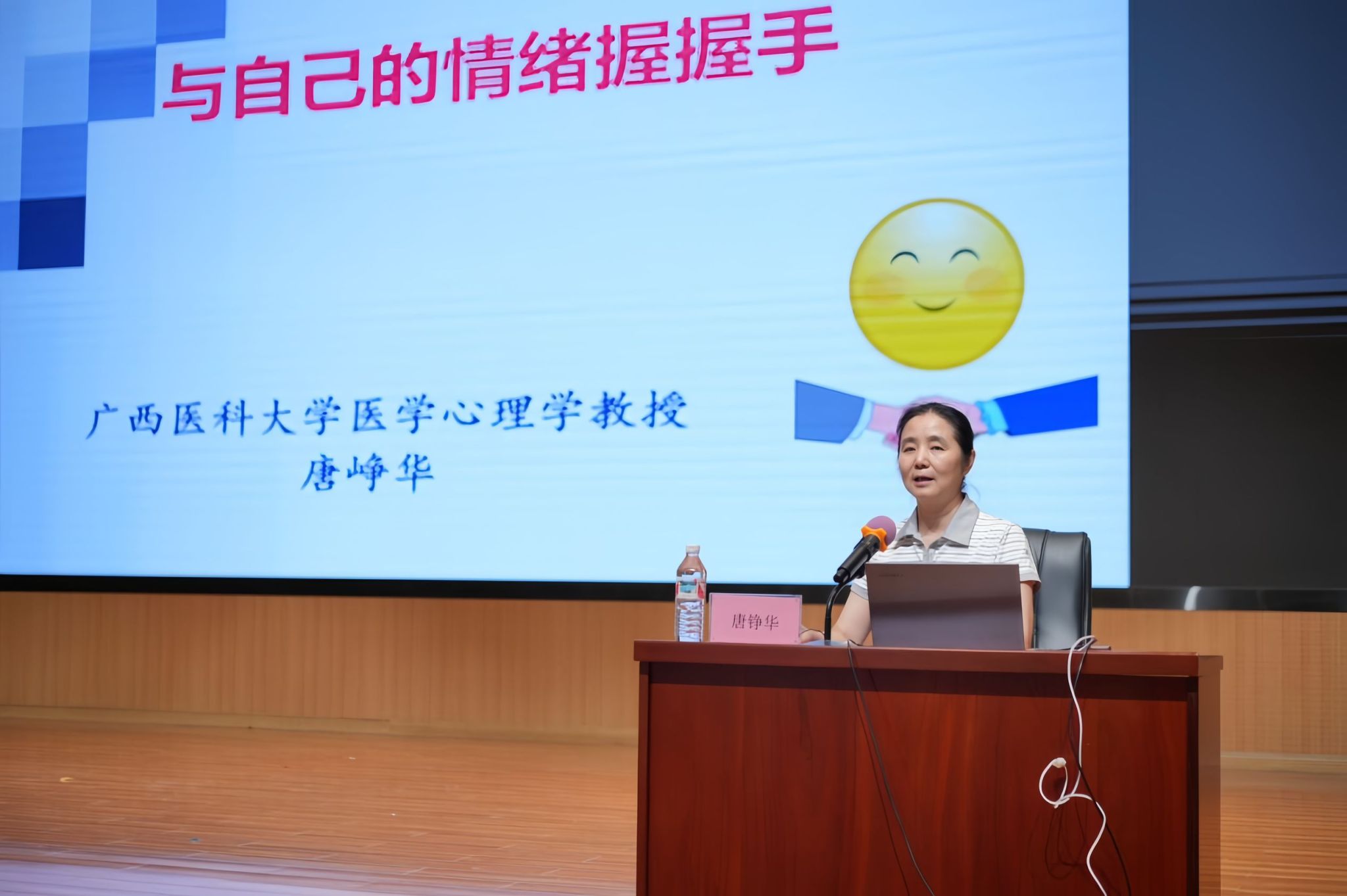 簽約揭牌儀式后,參會(huì)領(lǐng)導(dǎo)嘉賓一起觀看了第2個(gè)全國學(xué)生心理健康宣傳教育月活動(dòng)啟動(dòng)儀式文藝表演,并參觀了學(xué)校“一站式”學(xué)生社區(qū)和校心理中心,進(jìn)一步了解學(xué)校心理健康教育工作的開展情況;同時(shí),學(xué)校也邀請了廣西醫(yī)科大學(xué)醫(yī)學(xué)心理學(xué)唐崢華教授,為參加啟動(dòng)儀式的600余名師生開展了《與自己的情緒握握手》心理健康教育主題講座。