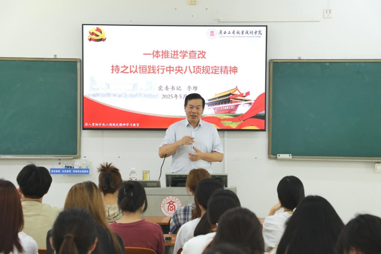 學校黨委書記李維以《一體化推進學查收 持之以恒踐行中央八項規(guī)定精神》為主題,為視覺2407班同學講授思想政治理論課。他從學習領會中央八項規(guī)定及其實施細則精神、深入貫徹中央八項規(guī)定精神學習教育的成效和經驗、開展深入貫徹中央八項規(guī)定精神學習教育三個方面開展授課,詳細解讀中央八項規(guī)定及其實施細則精神,列舉典型案例,加深同學們對黨風廉政建設的理解。