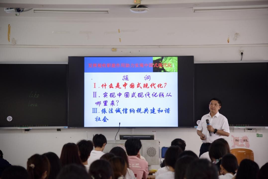 學校黨委副書記安仲文以《發(fā)揮稅收職能作用助力實現(xiàn)中國式現(xiàn)代化》為題,為室內2407班、室內2408班的同學講授思政課。他結合黨的二十屆三中全會精神講述中國式現(xiàn)代化及其本質特征,通過梳理稅收的起源與發(fā)展、我國稅種類型等揭示我國實現(xiàn)中國式現(xiàn)代化的資金來源,結合稅收的作用、豐富的稅收數(shù)據(jù),深入淺出地講解稅收在助力中國式現(xiàn)代化建設中發(fā)揮的作用,幫助同學們直觀地了解國家稅收的重要意義。