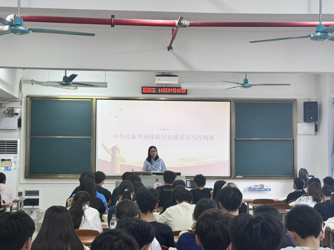 學校副校長鄭華以《中華民族共同體的歷史演進與當代構建》為題,為檢驗2401班、糧工2401班的同學講授為什么要推進中華民族共同體建設,結合實際生動講述中國古代各民族如何走向融合,從立足文明特征、堅持正確道路和深化建設路徑三個方面講授了新時代如何推進中華民族共同體建設,呼吁同學們要做新時代民族團結進步事業(yè)實踐者、推動者和守護者。