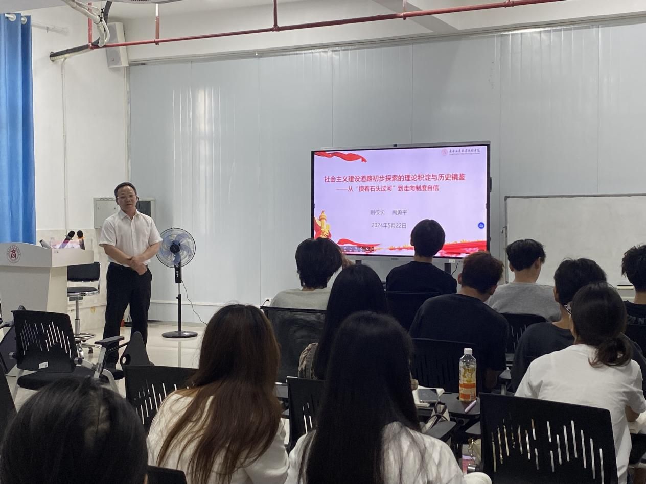 學校副校長闕勇平以《社會主義建設道路初步探索的理論積淀與歷史鏡鑒——從“摸著石頭過河”到走向制度自信》為題,給會信2402班的同學們帶來了一堂精彩絕倫的思政課。他運用相關事例進行講解,豐富了同學們對社會主義發(fā)展階段、“四個現(xiàn)代化”戰(zhàn)略目標,以及科學教育文化工作、國防建設、祖國統(tǒng)一和外交工作等思想理論成果的認識,幫助同學們增強我國社會主義制度的自信心。