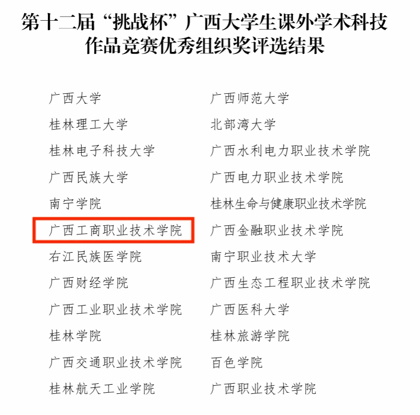 第十二屆 “挑戰(zhàn)杯” 廣西大學(xué)生課外學(xué)術(shù)科技作品競賽已于近日圓滿落幕,此次競賽中,我校共有26個項(xiàng)目獲獎,其中,獲特等獎7項(xiàng)、一等獎5項(xiàng)、二等獎7項(xiàng)、三等獎7項(xiàng),并再次獲得“優(yōu)勝杯”1項(xiàng)和優(yōu)秀組織獎1項(xiàng)。我校特等獎獲獎數(shù)量在全區(qū)高校中位列第四,團(tuán)隊(duì)總獲獎數(shù)位居全區(qū)高職高專學(xué)校首位。