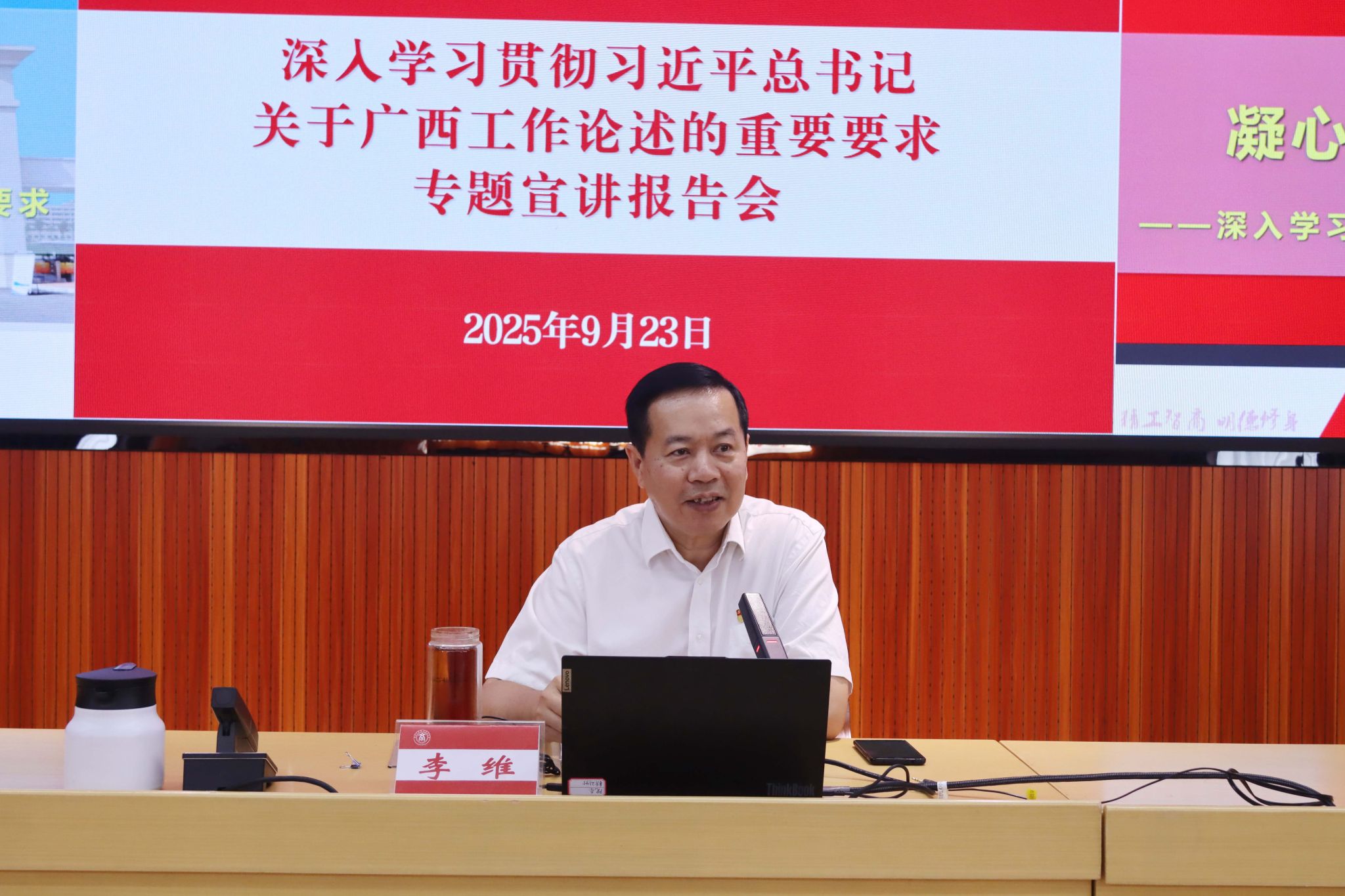 李維書記在宣講報(bào)告中指出,習(xí)近平總書記對廣西工作高度重視,多次親臨廣西考察調(diào)研,多次就廣西工作發(fā)表重要講話、作出重要指示批示,深刻闡明了事關(guān)廣西發(fā)展全局的根本性、方向性、戰(zhàn)略性問題,為建設(shè)新時(shí)代壯美廣西樹立了新的歷史坐標(biāo)、提供了新的戰(zhàn)略指引。他強(qiáng)調(diào),學(xué)校經(jīng)過70多年的接續(xù)奮斗,各項(xiàng)建設(shè)走上高質(zhì)量發(fā)展的快車道。學(xué)校黨委將進(jìn)一步全面深化改革、開拓創(chuàng)新、砥礪奮進(jìn),牢固樹立“實(shí)干為要、創(chuàng)新為魂,用業(yè)績說話、讓人民評(píng)價(jià)”的鮮明導(dǎo)向,圍繞落實(shí)立德樹人根本任務(wù),堅(jiān)持提質(zhì)量、強(qiáng)效能、穩(wěn)保障、惠民生,提高辦學(xué)水平、增強(qiáng)綜合實(shí)力、實(shí)現(xiàn)學(xué)校高質(zhì)量發(fā)展。他勉勵(lì)學(xué)校學(xué)子,要牢記習(xí)近平總書記殷切囑托,堅(jiān)定不移聽黨話、跟黨走,爭做有理想、敢擔(dān)當(dāng)、能吃苦、肯奮斗的新時(shí)代好青年,在推進(jìn)強(qiáng)國建設(shè)、民族復(fù)興偉業(yè)中展現(xiàn)作為、彰顯風(fēng)采、貢獻(xiàn)力量,奮力書寫中國式現(xiàn)代化廣西篇章的青春答卷。