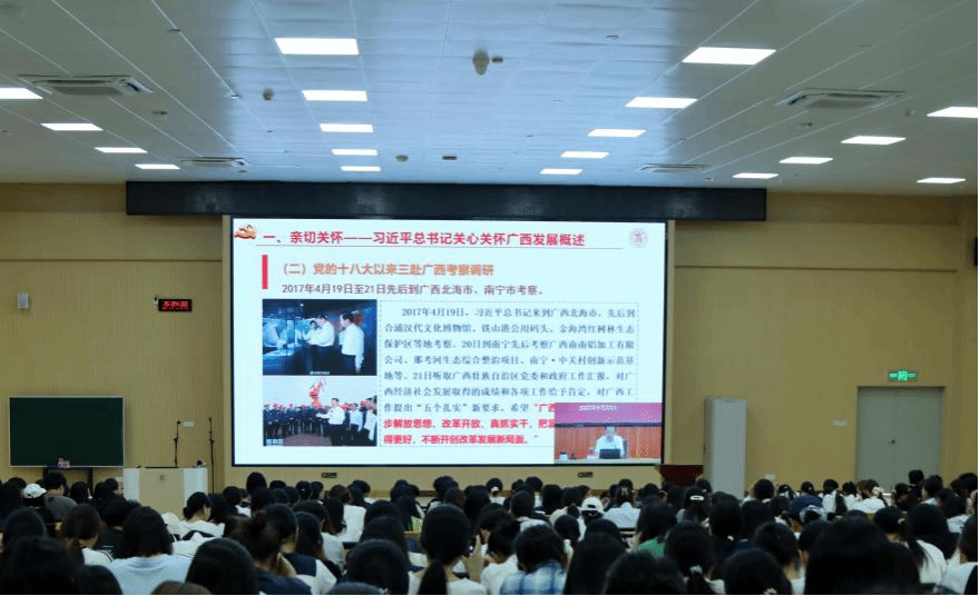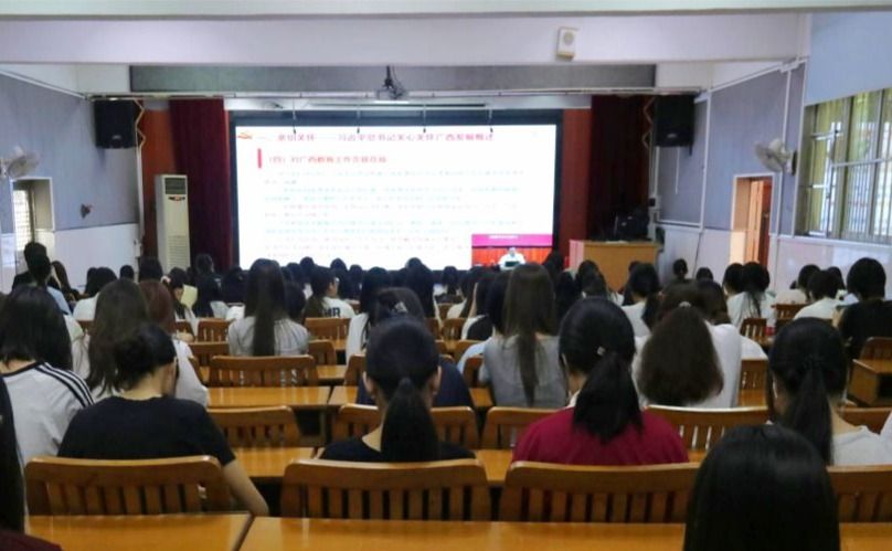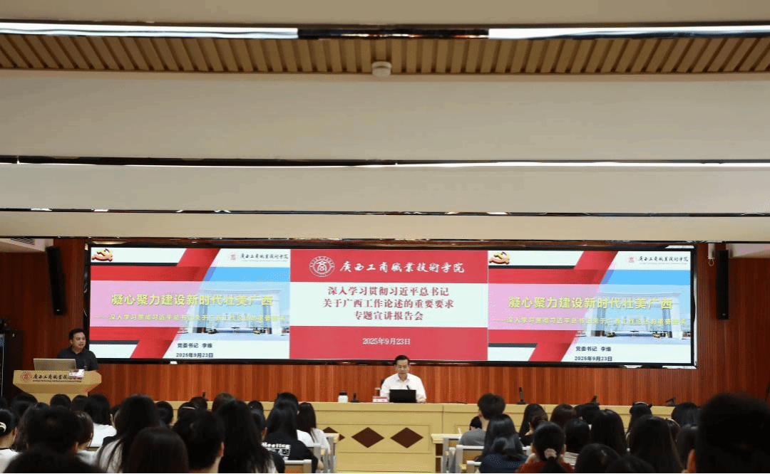 為深入學(xué)習(xí)貫徹習(xí)近平總書記關(guān)于廣西工作論述的重要要求,鑄牢中華民族共同體意識(shí),推動(dòng)黨的創(chuàng)新理論有效觸達(dá)青年群體,根據(jù)自治區(qū)黨委宣傳部《理論宣講青年群體全覆蓋三年行動(dòng)計(jì)劃工作方案》安排,9月23日,學(xué)校在鵬飛校區(qū)舉辦深入學(xué)習(xí)貫徹習(xí)近平總書記關(guān)于廣西工作論述的重要要求專題宣講報(bào)告會(huì),學(xué)校黨委書記李維作題為《凝心聚力建設(shè)新時(shí)代壯美廣西——深入學(xué)習(xí)貫徹習(xí)近平總書記關(guān)于廣西工作論述的重要要求》的專題宣講報(bào)告。宣講報(bào)告會(huì)采取線下講授、線上直播結(jié)合的形式展開,全體在校生聽取報(bào)告會(huì)。