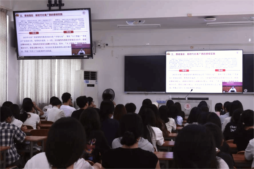 宣講報(bào)告會(huì)站位高遠(yuǎn)、主題鮮明、內(nèi)容豐富、講解深入淺出。宣講報(bào)告會(huì)結(jié)束后,同學(xué)們表示,將牢記囑托、感恩奮進(jìn),努力夯實(shí)專業(yè)基礎(chǔ),把個(gè)人奮斗融入新時(shí)代壯美廣西建設(shè)中,爭當(dāng)助力廣西高質(zhì)量發(fā)展的生力軍。