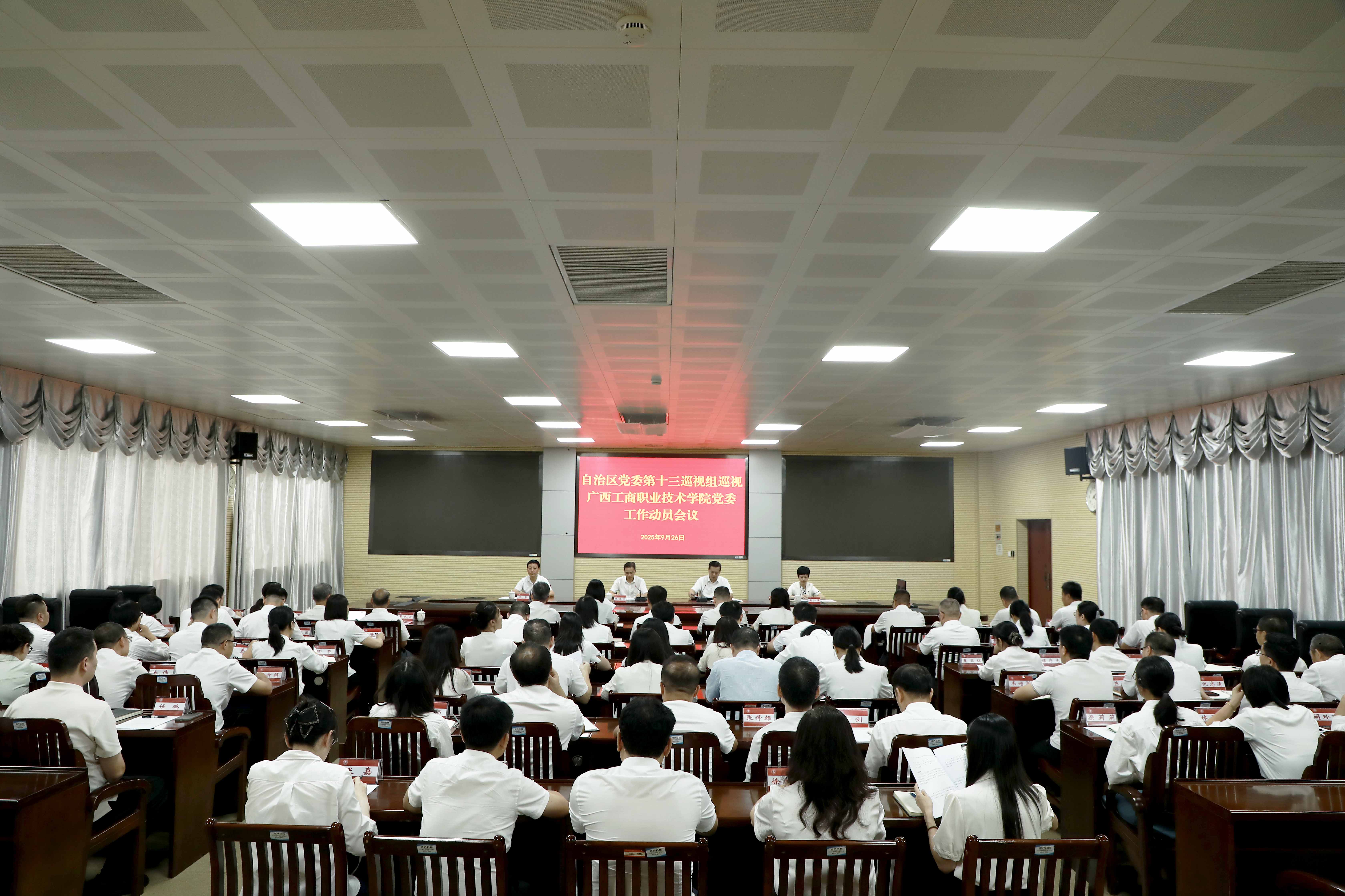 根據(jù)自治區(qū)黨委統(tǒng)一部署,2025年9月26日下午,十二屆自治區(qū)黨委第八輪巡視第十三巡視組巡視廣西工商職業(yè)技術(shù)學(xué)院黨委工作動(dòng)員會(huì)召開。自治區(qū)黨委第十三巡視組組長陸海生受自治區(qū)黨委巡視工作領(lǐng)導(dǎo)小組委托,就深入學(xué)習(xí)貫徹習(xí)近平總書記重要講話精神,自覺接受巡視監(jiān)督,支持配合本輪巡視工作提出明確要求,并通報(bào)本輪巡視的主要任務(wù)和工作安排。廣西工商職業(yè)技術(shù)學(xué)院黨委書記李維主持會(huì)議并作表態(tài)發(fā)言。