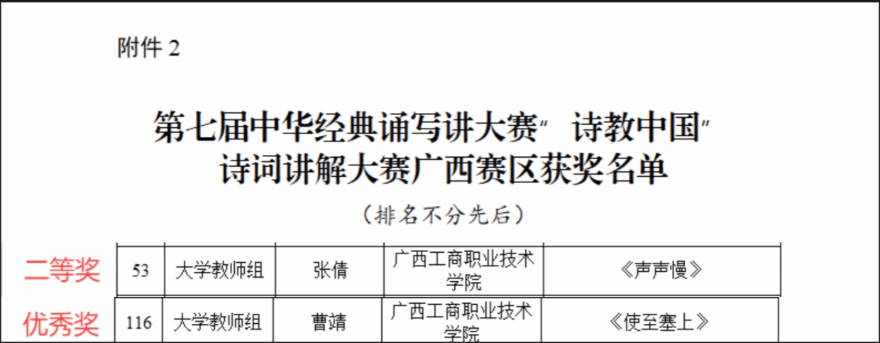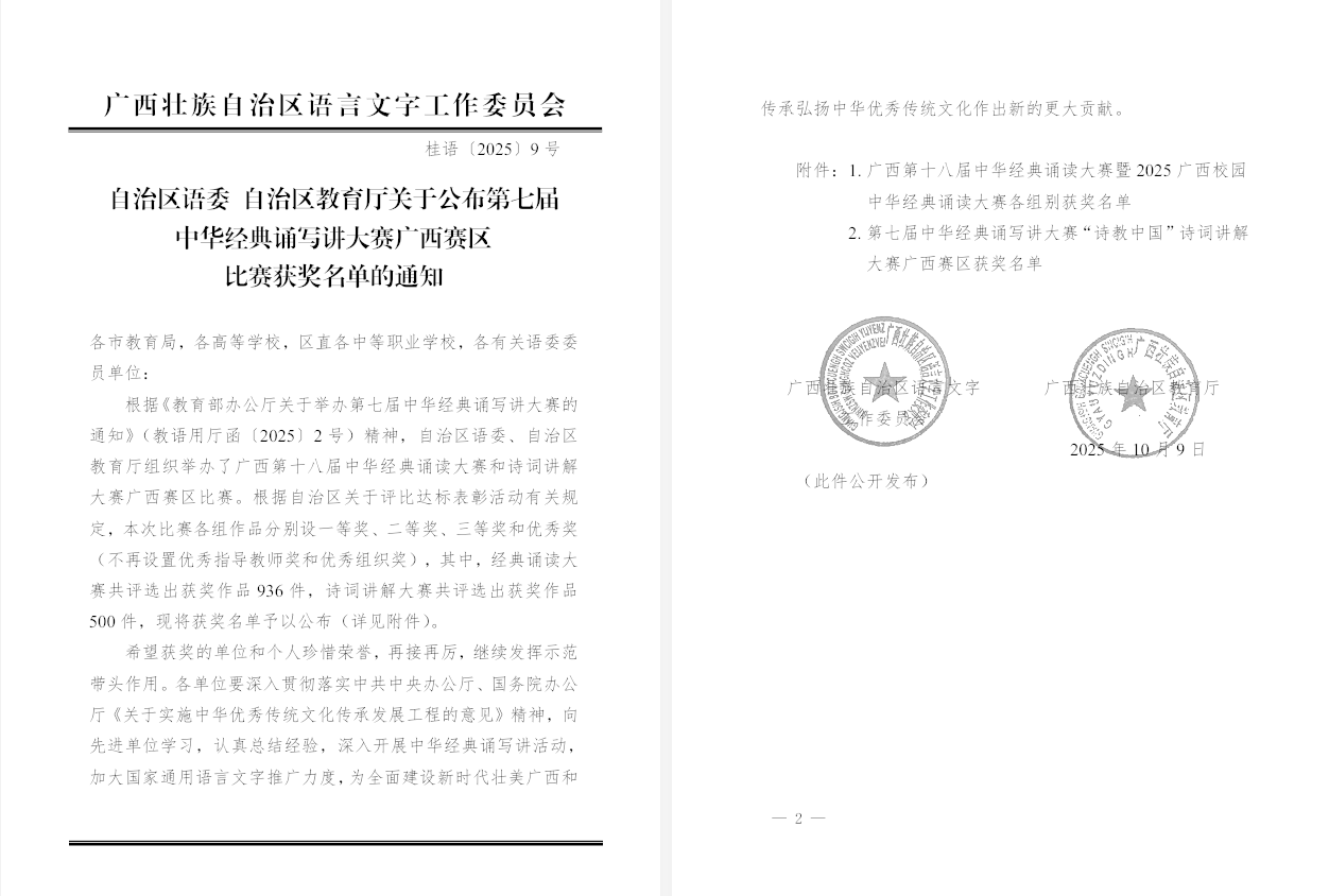近日,廣西壯族自治區(qū)語(yǔ)言文字工作委員會(huì)、廣西壯族自治區(qū)教育廳公布了第七屆中華經(jīng)典誦寫(xiě)講大賽廣西賽區(qū)比賽獲獎(jiǎng)名單,我校師生在本屆賽事中再創(chuàng)歷史新高: