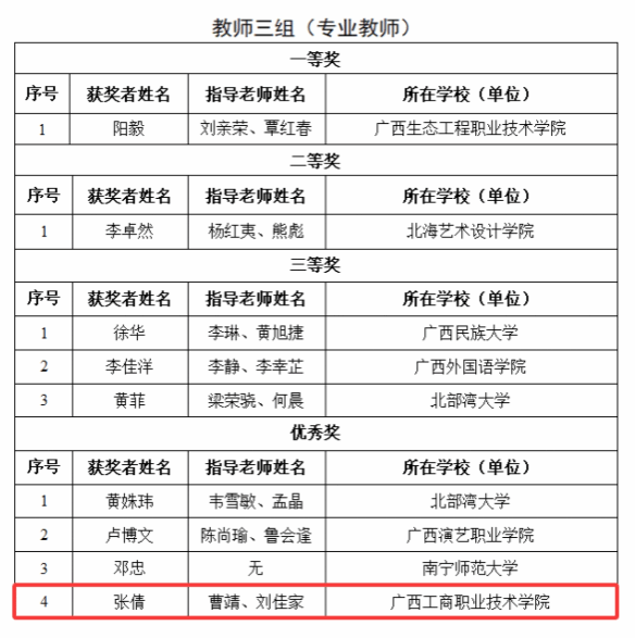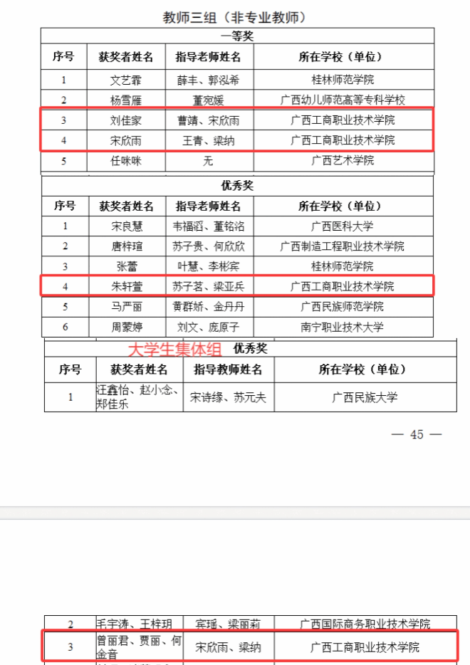 其中,在廣西第十八屆中華經(jīng)典誦讀大賽暨2025廣西校園中華經(jīng)典誦讀大賽大學(xué)生二組獲一等獎(jiǎng)1項(xiàng)、二等獎(jiǎng)1項(xiàng)、三等獎(jiǎng)4項(xiàng),教師三組(非專(zhuān)業(yè)教師)獲一等獎(jiǎng)2項(xiàng)、優(yōu)秀獎(jiǎng)1項(xiàng),教師三組(專(zhuān)業(yè)教師)獲優(yōu)秀獎(jiǎng)1項(xiàng),大學(xué)生集體組獲優(yōu)秀獎(jiǎng)1項(xiàng)。在第七屆中華經(jīng)典誦寫(xiě)講大賽"詩(shī)教中國(guó)"詩(shī)詞講解大賽(廣西賽區(qū))大學(xué)教師組獲二等獎(jiǎng)1項(xiàng)、優(yōu)秀獎(jiǎng)1項(xiàng)。
