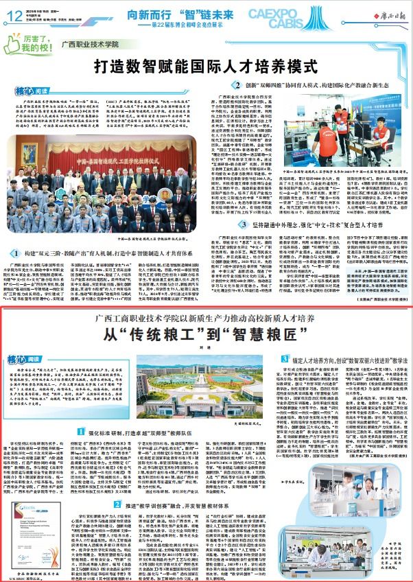 2025年9月15日,《廣西日報(bào)》第22屆東博會(huì)和峰會(huì)亮點(diǎn)展示專版刊登學(xué)校校長劉進(jìn)署名文章,標(biāo)題為:《從“傳統(tǒng)糧工”到 “智慧糧匠”:廣西工商職業(yè)技術(shù)學(xué)院以新質(zhì)生產(chǎn)力推動(dòng)高校新質(zhì)人才培養(yǎng)》,全文如下: