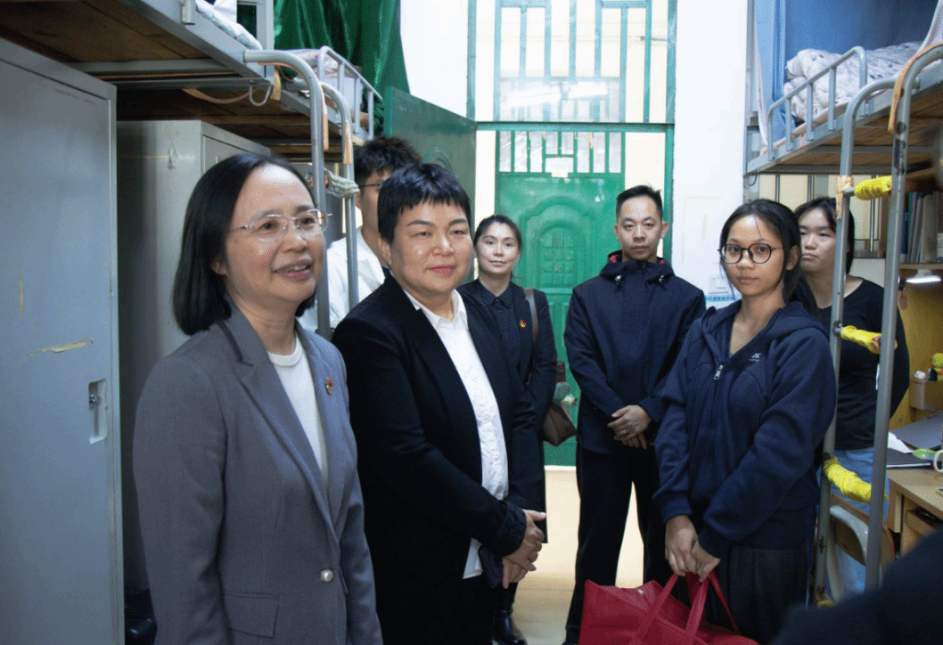 韋云鳳到學(xué)生宿舍12棟進(jìn)行走訪慰問(wèn)。走訪中,韋云鳳與同學(xué)們展開(kāi)交談,細(xì)致詢(xún)問(wèn)了每個(gè)人的學(xué)習(xí)情況、生活狀況和未來(lái)規(guī)劃。她特別關(guān)心家庭經(jīng)濟(jì)困難學(xué)生的實(shí)際需求,詳細(xì)了解了助學(xué)金評(píng)定、生源地貸款辦理等的落實(shí)情況。韋云鳳充分肯定了同學(xué)們?cè)谀婢持凶詮?qiáng)不息、勤奮學(xué)習(xí)的精神。她親切的話語(yǔ)和真誠(chéng)的關(guān)懷,讓同學(xué)們倍感溫暖。韋云鳳強(qiáng)調(diào),學(xué)校始終是同學(xué)們的堅(jiān)強(qiáng)后盾,將持續(xù)優(yōu)化各項(xiàng)服務(wù)保障措施,努力為大家創(chuàng)造更好的學(xué)習(xí)生活環(huán)境。走訪期間,她還代表學(xué)校為同學(xué)們送上了精心準(zhǔn)備的愛(ài)心禮包。