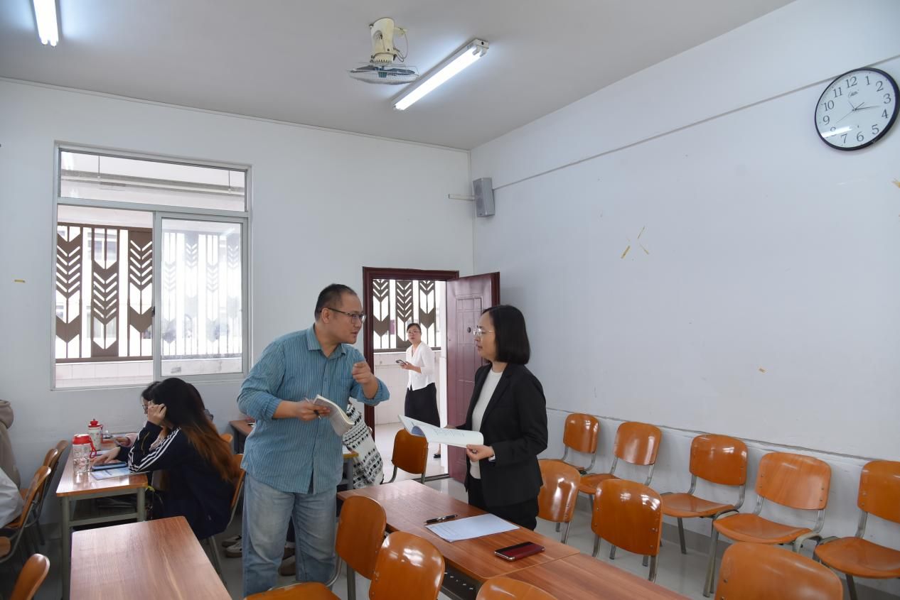課后,學(xué)校黨委副書記、紀(jì)委書記韋云鳳與授課教師交流