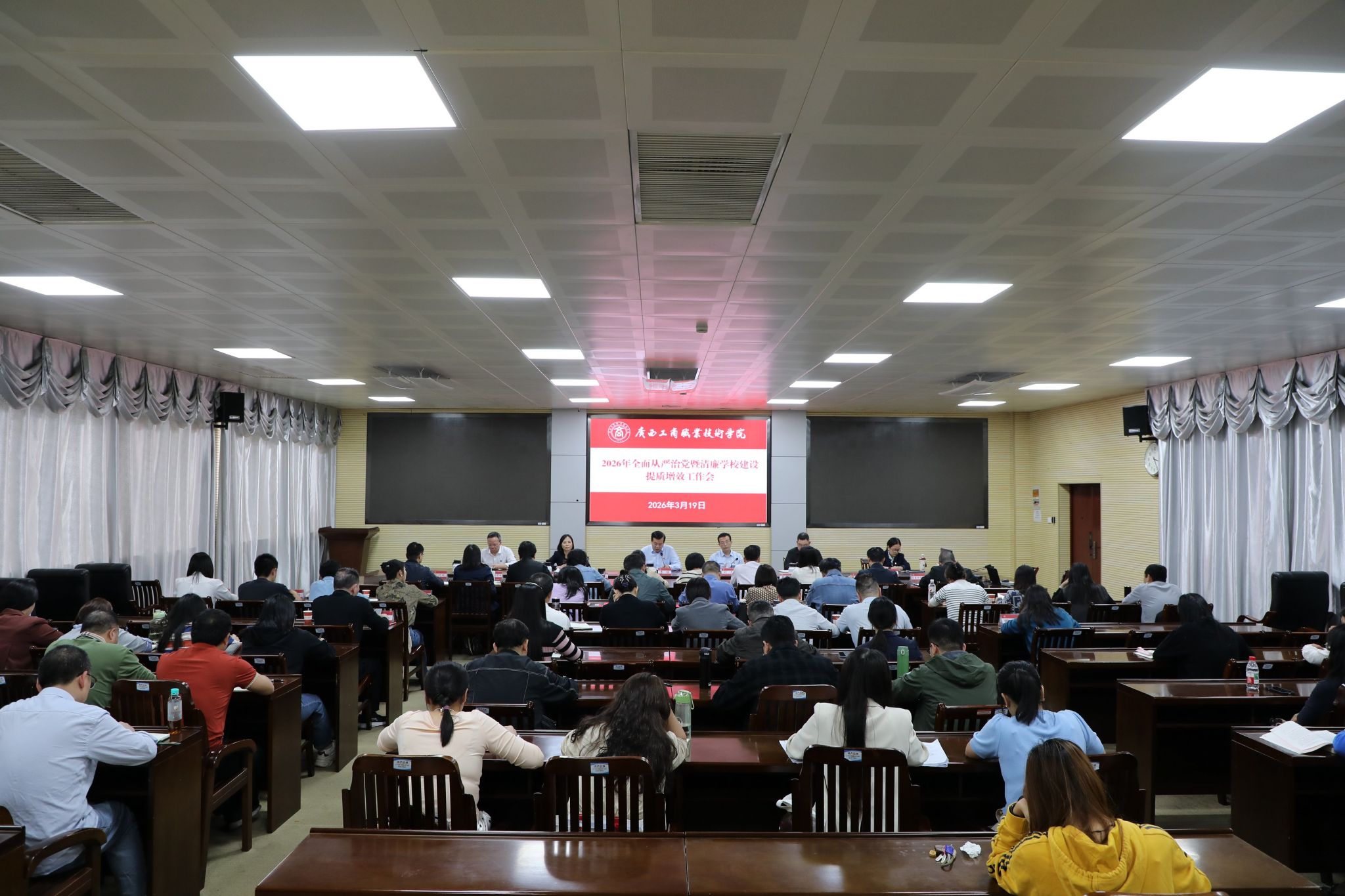 3月19日,學校在鵬飛校區(qū)召開2026年全面從嚴治黨暨清廉學校建設提質增效工作會。學校黨委書記李維在會上發(fā)表講話,黨委副書記、校長劉進主持會議,黨委副書記、紀委書記韋云鳳對學校2026年紀檢監(jiān)察工作作工作部署。