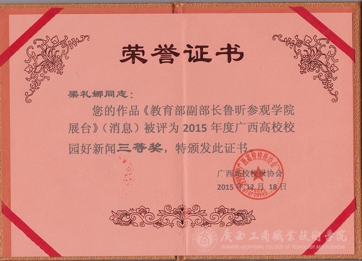 我院官網榮獲“最佳新聞網站”三等獎;我院官網《掛職干部專題》榮獲“最佳新聞網站欄目”三等獎;我院學生梁禮娜《教育部副部長魯昕參觀學院我院展臺》榮獲“校園好新聞”三等獎。