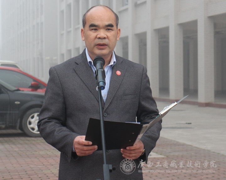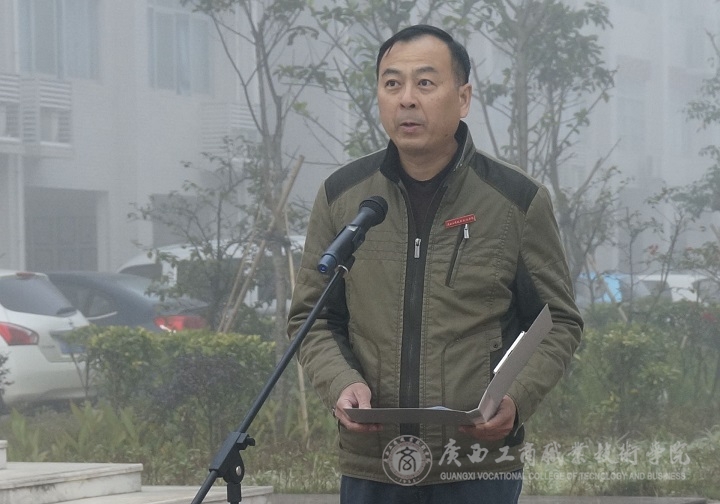 (學(xué)院黨委副書記蒙啟成主持升旗儀式)