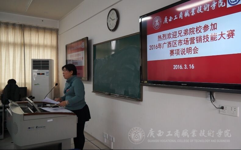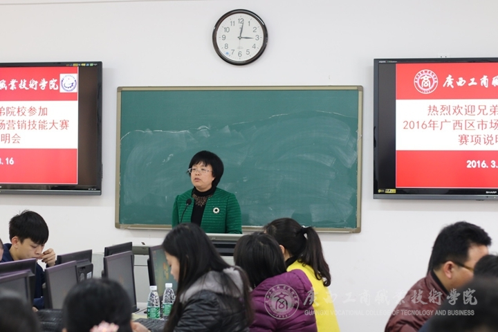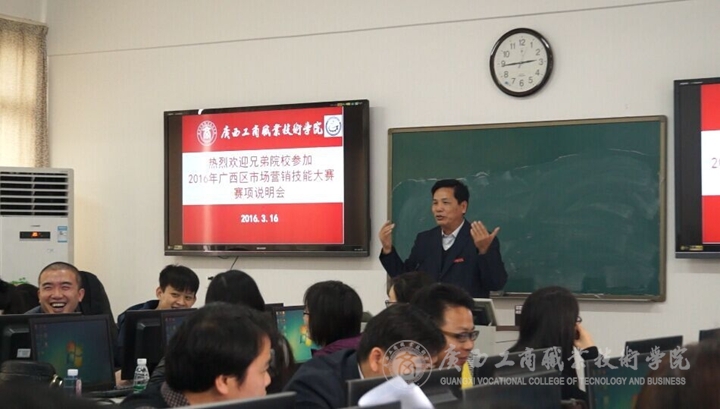 2016年3月16日14時, 2016年廣西職業(yè)院校技能大賽高職組市場營銷技能賽項說明會在我院本部教學(xué)樓2511教室舉行。學(xué)院教務(wù)科研處處長韋勝強教授、經(jīng)管系譚波主任、高職研究所副所長葉桂中教授和來自全區(qū)大部分參賽院校領(lǐng)隊和指導(dǎo)教師、營銷技能競賽技術(shù)支持單位代表共40多人參加了賽項說明會。
