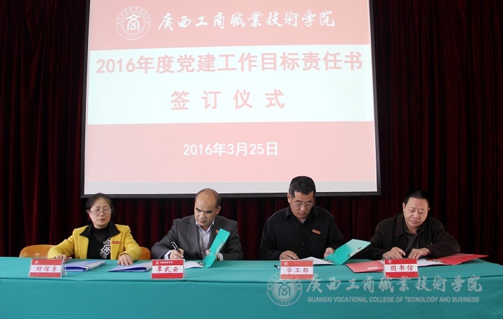 在會(huì)上,簽訂了學(xué)院《2016年度黨建工作目標(biāo)責(zé)任書》和《2016年黨風(fēng)廉政建設(shè)責(zé)任書》。首先是各部門負(fù)責(zé)人與學(xué)院黨委書記覃武云簽訂《2016年度黨建工作目標(biāo)責(zé)任書》。隨后,各部門負(fù)責(zé)人再次與學(xué)院黨委書記覃武云,學(xué)院黨委副書記、院長(zhǎng)陳杰簽訂《2016年黨風(fēng)廉政建設(shè)責(zé)任書》。