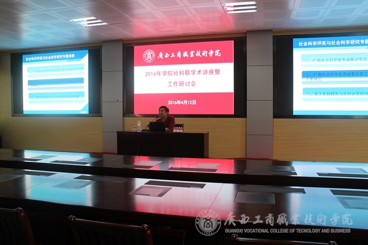 為進(jìn)一步加強(qiáng)師資隊(duì)伍建設(shè),規(guī)范我校社會(huì)科學(xué)研究及評(píng)獎(jiǎng)申報(bào)工作程序,加強(qiáng)我校哲學(xué)社會(huì)科學(xué)項(xiàng)目暨廣西第十四次社會(huì)科學(xué)優(yōu)秀成果獎(jiǎng)申報(bào)組織工作,全面提高我校教師的教學(xué)、科研學(xué)術(shù)能力以及科研成果轉(zhuǎn)化工作水平,2016年4月12日下午15:00,我院在校本部2119會(huì)議室舉辦了“社科聯(lián)學(xué)術(shù)講座暨工作研討會(huì)”,學(xué)院社科聯(lián)特別邀請(qǐng)了自治區(qū)社科聯(lián)黨組成員、副主席曹平研究員為我院教師作了題為《社會(huì)科學(xué)評(píng)獎(jiǎng)與社會(huì)科學(xué)研究》的專題講座。講座由我院社科聯(lián)主席、學(xué)院黨委副書記兼紀(jì)委書記蒙啟成主持,會(huì)計(jì)系、經(jīng)管系、財(cái)信系、社科部、公共部、學(xué)工部等六個(gè)教學(xué)系部及相關(guān)行政部門的近100名教師聆聽了講座。