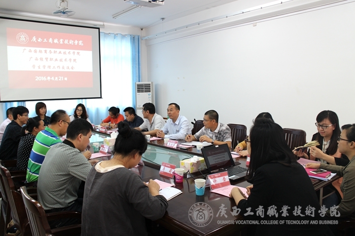 2016年4月21日下午,廣西國際商務(wù)職業(yè)技術(shù)學(xué)院學(xué)工處羅蘭芬處長一行,廣西經(jīng)貿(mào)職業(yè)技術(shù)學(xué)院學(xué)工處潘文生處長一行到我院就學(xué)生公寓管理、學(xué)生日常事務(wù)管理等方面的內(nèi)容與我院學(xué)工處進(jìn)行了工作交流。學(xué)院黨委蒙啟成副書記親切接見了來訪的兄弟院校同仁,黨委學(xué)工部付光部長主持了交流會(huì)。