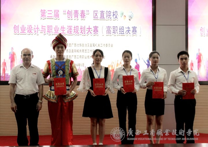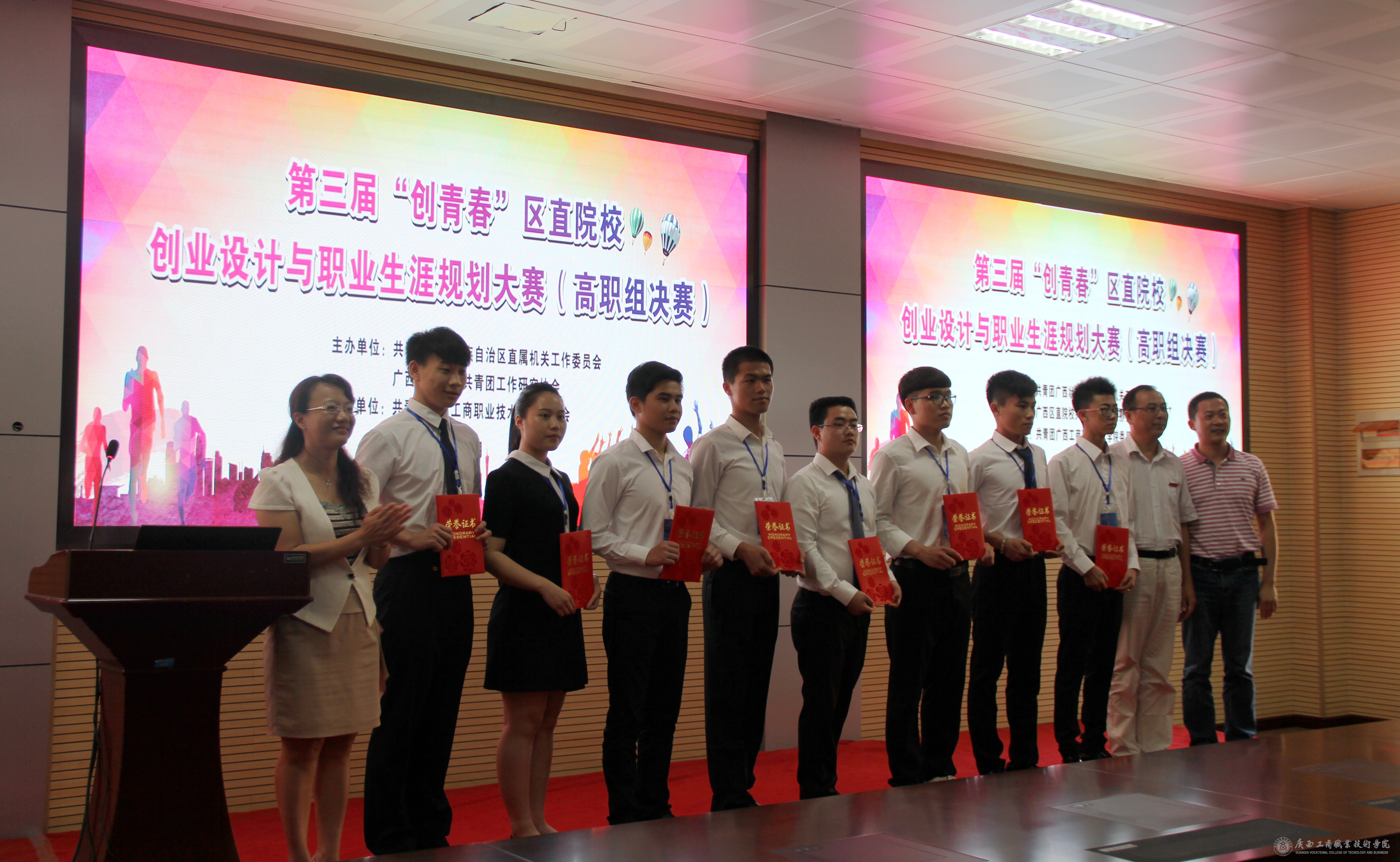 至決賽尾聲,由共青團廣西區(qū)委副書記劉玄啟和我院黨委書記覃武云分別給榮獲一等獎、二等獎的選手頒獎,我院黨委副書記、紀委書記蒙啟成、自治區(qū)直屬機關(guān)團工委書記謝萍、共青團廣西區(qū)委學(xué)校部部長鐘聲宇為榮獲三等獎的選手頒獎。2016年第三屆“創(chuàng)青春”區(qū)直院校、創(chuàng)業(yè)設(shè)計與職業(yè)生涯規(guī)劃大賽決賽圓滿落下帷幕!