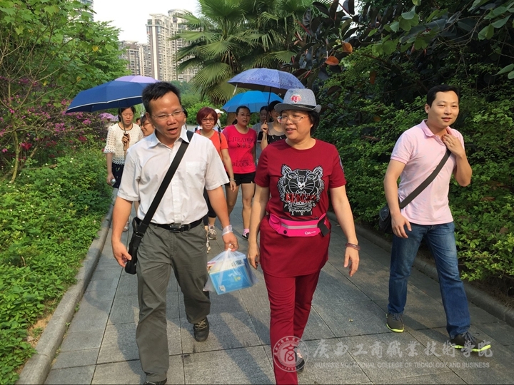 艷陽(yáng)普照,暑意正濃。2016年5月4日下午16:10,廣西工商職業(yè)技術(shù)學(xué)院全體教職工在學(xué)院校本部一同出發(fā)前往相思湖濕地公園開(kāi)展“享健康 跟我走”徒步尋寶活動(dòng),學(xué)院黨委副書(shū)記蒙啟成參與到“尋寶”隊(duì)伍中,共有70人參加了本次活動(dòng)。