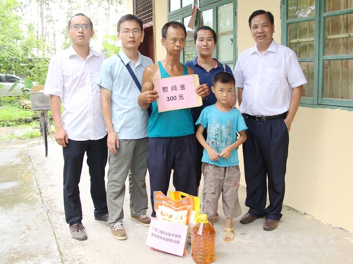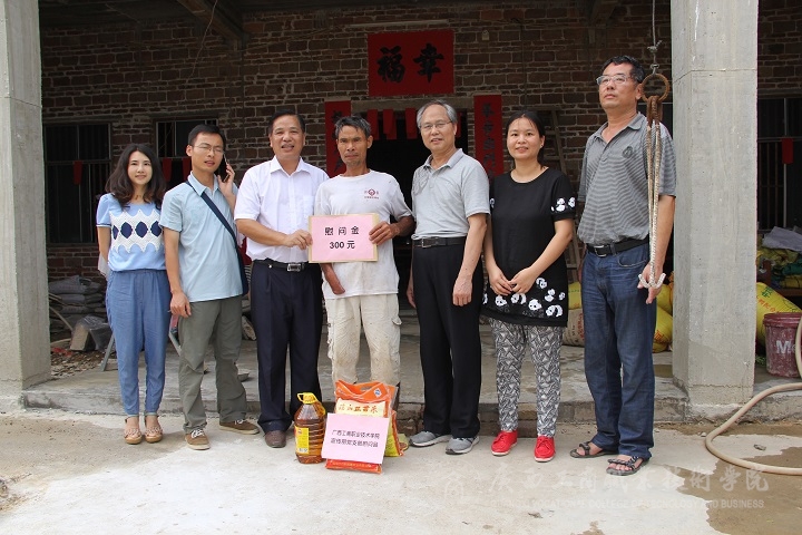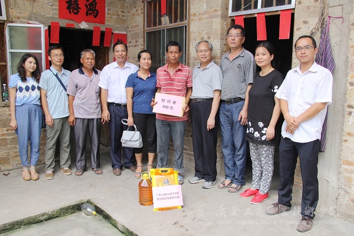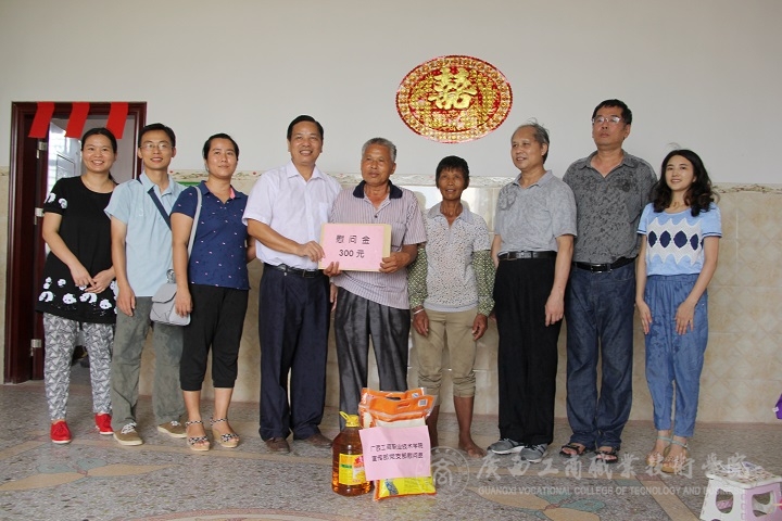 2016年7月8日,學(xué)院黃永蓬副廳級(jí)調(diào)研員率黨委宣傳部部長(zhǎng)韋勝?gòu)?qiáng)、后勤管理處處長(zhǎng)付光、宣傳部黨員教師等一行五人前往陸川縣看望駐四樂(lè)村第一書(shū)記羅北戰(zhàn)同志,走訪慰問(wèn)該村老黨員、困難黨員、困難群眾,并為當(dāng)?shù)匦W(xué)困難學(xué)子捐獻(xiàn)學(xué)習(xí)用品。