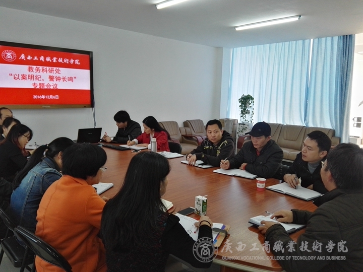 為深入貫徹落實學院《關于印發(fā)< “以案明紀”警示教育活動的實施方案>的通知》(廣商院黨字〔2016〕109 號)和《關于印發(fā)< 廣西工商職業(yè)技術學院重點部位和關鍵環(huán)節(jié)再監(jiān)督實施辦法(試行)>的通知》(廣商院紀字〔2016〕12號)文件精神,教務科研處于2016年12月6日下午開展了全處人員參加的“以案明紀”警示教育活動。