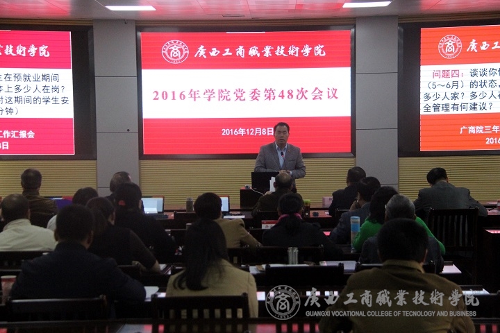 2016年12月8日下午3時,我院召開黨委會,聽取學院三年級管理工作匯報和畢業(yè)生就業(yè)創(chuàng)業(yè)工作匯報。學院黨委書記覃武云,黨委副書記、院長陳杰,黨委副書記、紀委書記蒙啟成,黨委委員、副院長李仕欽,黨委委員、副院長李維,學院副廳級調(diào)研員黃永蓬,黨委委員、副院長陳寧春和黨委委員蔣百平、覃超穎出席會議。會議由覃武云書記主持。
