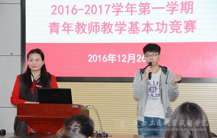 為進一步提高青年教師教學(xué)基本技能,促進青年教師樹立高職教育理念,磨練教學(xué)內(nèi)功,營造重視教學(xué)、追求卓越的氛圍,2016年12月26日下午,學(xué)院2016-2017學(xué)年第一學(xué)期青年教師教學(xué)基本功決賽在校本部教學(xué)樓2119視頻會議室隆重舉行。