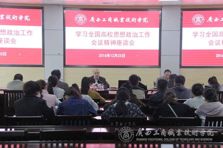 ??????? 2016 年 12 月 23 日上午,我院在校本部召開學(xué)習(xí)全國高校思想政治工作會議精神座談會。學(xué)院黨委書記覃武云,黨委副書記、紀(jì)委書記蒙啟成出席會議。黨委組織部、黨委宣傳部、黨委學(xué)生工作部、教務(wù)科研處、后勤管理處主要負(fù)責(zé)人,各系學(xué)生代表參加了此次會議。