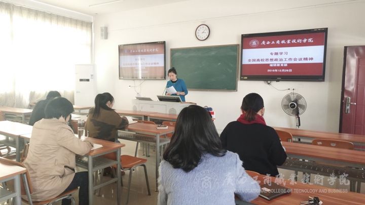 ??????? 2016年12月7日至8日,全國(guó)高校思想政治工作會(huì)議在北京召開(kāi),中共中央總書(shū)記、國(guó)家主席、中央軍委主席習(xí)近平出席會(huì)議并發(fā)表重要講話。根據(jù)學(xué)院統(tǒng)一部署和安排,12月27日下午,我院各部門(mén)、各單位組織本部門(mén)教職工在校本部集中學(xué)習(xí)全國(guó)高校思想政治作會(huì)議精神,傳達(dá)了《中共教育部黨組關(guān)于學(xué)習(xí)貫徹落實(shí)全國(guó)高校思想政治工作會(huì)議精神的通知》精神,觀看了新聞聯(lián)播關(guān)于《全國(guó)高校思想政治工作會(huì)議12月7日至8日在北京召開(kāi)》的視頻材料。