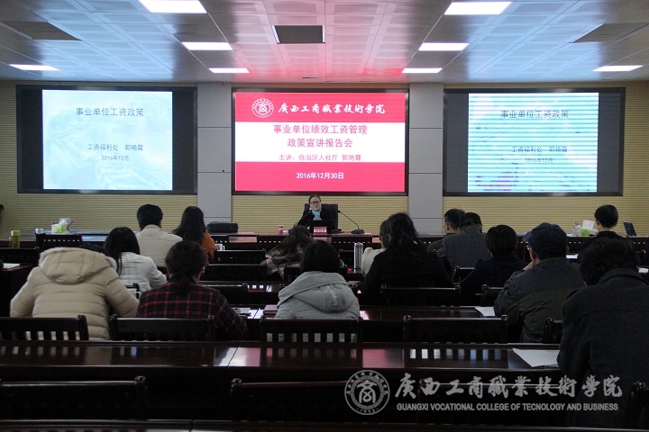 為推進(jìn)我???jī)效工資制度的實(shí)施工作,使全校教職員工更清楚地了解其方針、政策、實(shí)施辦法。2016年12月30日上午,我院事業(yè)單位績(jī)效工資管理政策宣講報(bào)告會(huì)在校本部召開(kāi)。我院教師參加本次報(bào)告會(huì)。會(huì)議由自治區(qū)人力資源和社會(huì)保障廳廳郭艷霞處長(zhǎng)、江河海科長(zhǎng)主講。