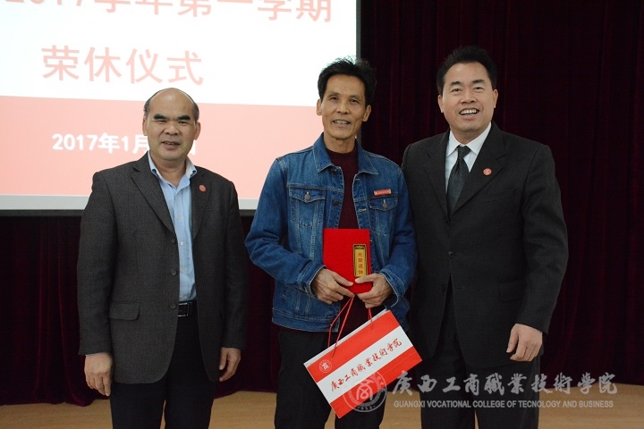 儀式上,蒙啟成副書記宣讀了2016年下半年退休教師名單,即周艷、陸尚平、陳可林三位老師。學(xué)院黨委書記覃武云和院長(zhǎng)陳杰為退休教師代表陳可林頒發(fā)榮休證書和榮休紀(jì)念品,并合影留念。