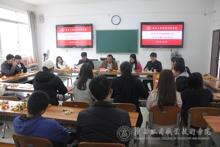2017年1月12日中午,學(xué)院黨委宣傳部新聞中心在學(xué)院校本部召開2017年新年座談會(huì),學(xué)院黨委副書記、紀(jì)委書記蒙啟成,學(xué)院黨委宣傳部部長(zhǎng)韋勝?gòu)?qiáng)、黨委宣傳部助理陳宇寧出席會(huì)議,新聞中心指導(dǎo)老師莫惘、馮艷瓊、雷航,新聞中心15級(jí)重要骨干和16級(jí)新生代表參加了此次座談會(huì)。