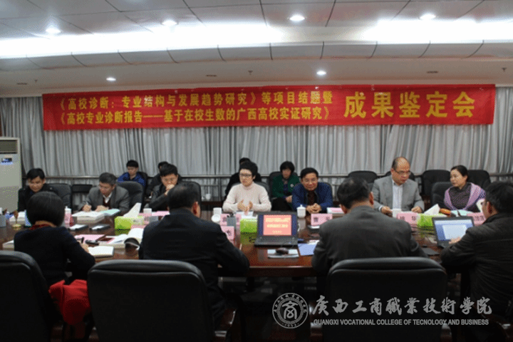 ??????? 據(jù)介紹,《高校診斷:專業(yè)結(jié)構(gòu)與發(fā)展趨勢研究》項目,是廣西壯族自治區(qū)教育廳以桂教科研〔2014〕8號文件下達的由我院院長陳杰教授為負(fù)責(zé)人承擔(dān)的委托課題。《基于分專業(yè)在校生數(shù)的廣西高等學(xué)校專業(yè)診斷分析》項目組是在自治區(qū)教育廳李向紅處長及陳杰院長的帶領(lǐng)下,由自治區(qū)教育廳規(guī)劃處干部和廣西工商職院科研人員23人共同組成。該項目以廣西工商職業(yè)技術(shù)學(xué)院職業(yè)教育研究所為研究基地,歷經(jīng)3年,經(jīng)團隊成員反反復(fù)復(fù)無數(shù)次集中推敲、分散論證,再集中研討,才最后確定研究方案。在研究過程中,項目組成員通過參照國家相關(guān)法規(guī)文件,制定了若干高校評價工具和模型,先后設(shè)計了12個課題標(biāo)準(zhǔn)表。在制訂12個《標(biāo)準(zhǔn)表》的基礎(chǔ)上,項目組經(jīng)反復(fù)研討,設(shè)計了系列《數(shù)據(jù)表》,再將廣西全區(qū)高校數(shù)據(jù)倒入表格,進行對比分析,不斷修改、完善,形成了《診斷報告模板》。