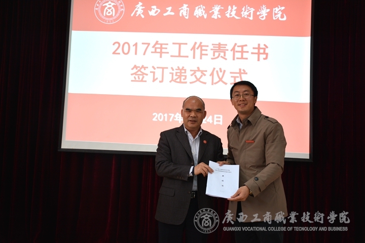 ??????? 會(huì)議第一項(xiàng)議程是舉行2017年工作責(zé)任書(shū)簽訂遞交儀式,覃武云同志與各部門(mén)負(fù)責(zé)人分別簽訂了2017年工作責(zé)任書(shū),即黨建和黨風(fēng)廉政建設(shè)責(zé)任書(shū)、意識(shí)形態(tài)工作主體責(zé)任書(shū)、安全穩(wěn)定工作責(zé)任書(shū)。覃武云同志表示,今年的責(zé)任書(shū)一改往年在專(zhuān)項(xiàng)會(huì)議上簽訂的模式,在全體教職工的見(jiàn)證下簽訂,希望各部門(mén)、各單位會(huì)后在本部門(mén)內(nèi)層層傳導(dǎo)壓力,落實(shí)責(zé)任,為學(xué)院的中心任務(wù)提供強(qiáng)有力的組織保障。